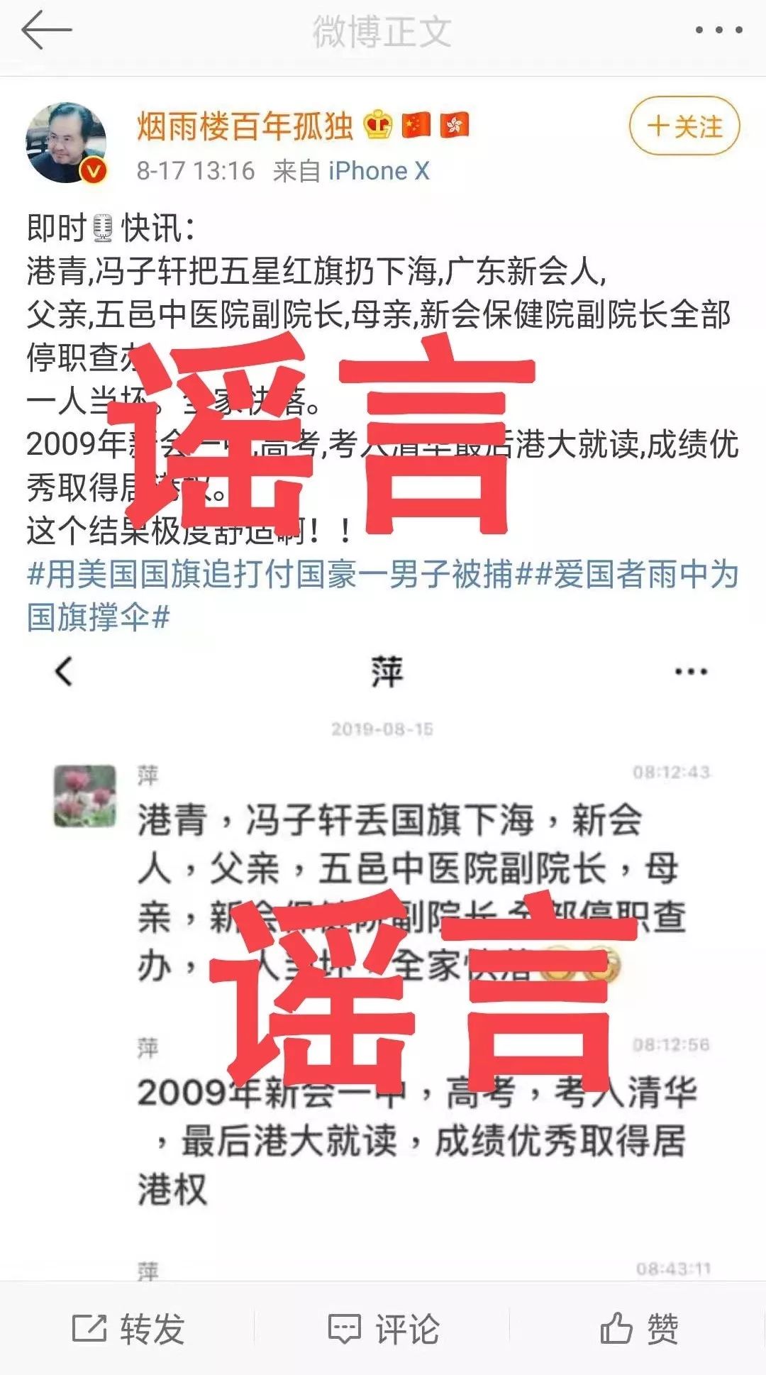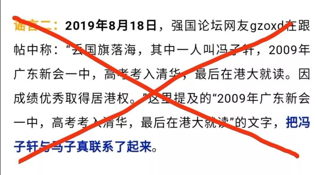 2019年8月15日起,微博和微信有传闻称:“快讯:香港新闻报道,这个丢国旗进海的港毒废青,前天已经被香港警方逮捕。经查,这个汉奸叫冯子轩,是港大学生,广东新会高考状元,09年考入清华转港大,因考试成绩优异而被批准入户香港并被洗脑成为港毒分子。其父亲是新会五邑中医院院长,母亲是妇幼保健院副院长,因受其儿子影响双双被调查,并被查出有经济问题,现已全部停职。这就是从小只培养孩子钢琴,奥数,外语等,忽视了做人的教育,爱国情怀教育的悲剧!!!有国才有家,若国家动荡不安,家又何在!”(以下简称“快讯”)
