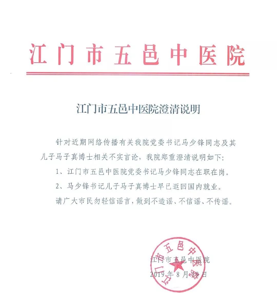 开云电竞官方网站五邑中医院在2019年8月19日中午发布澄清说明:“针对近期网络传播有关我院党委书记马少锋同志及其儿子马子真博士相关不实言论,我院郑重澄清说明如下: