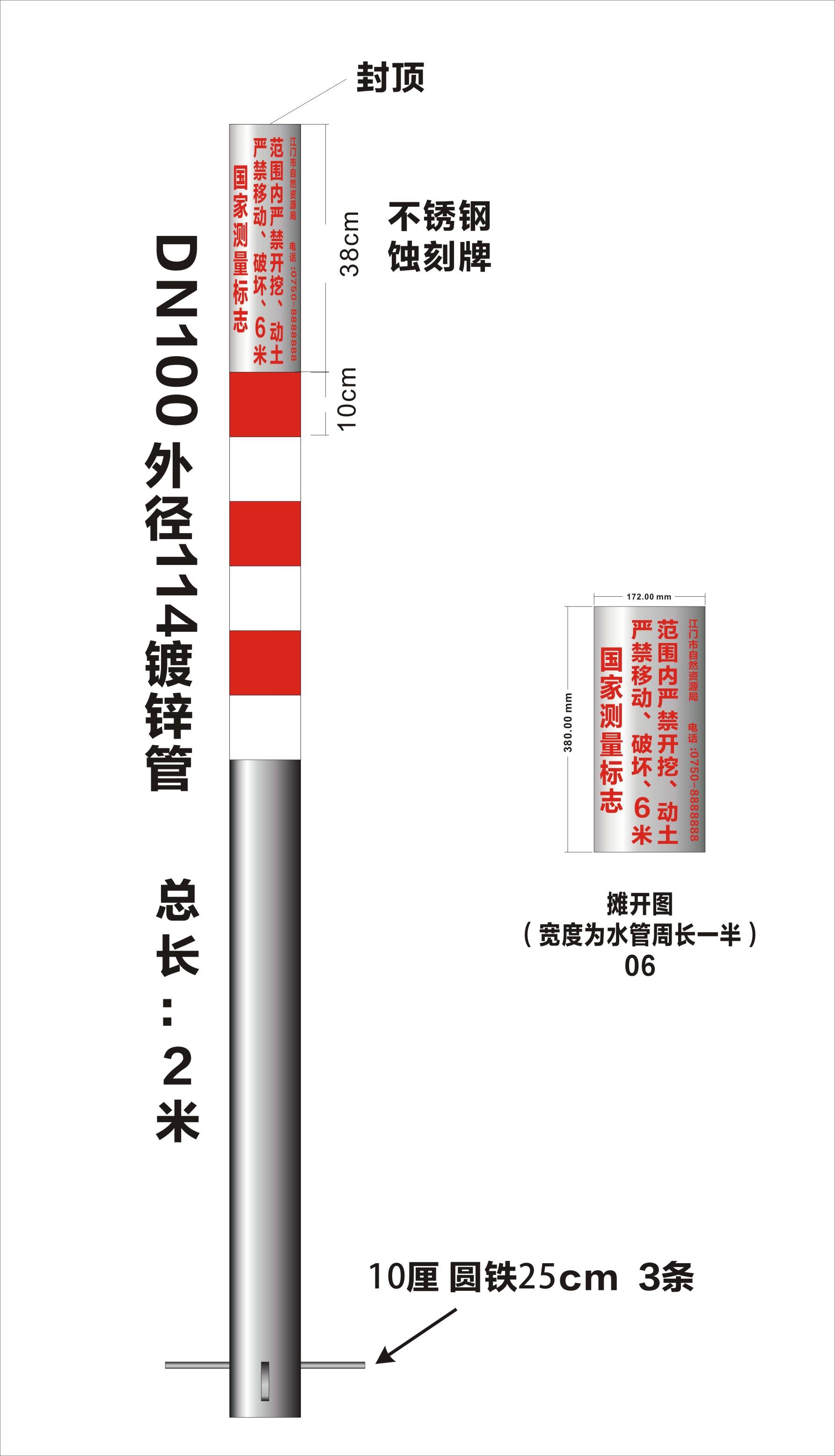 4、柱状支架管径为DN100,外径114,长度不应小于2米,入土深度不小于0.5米,支架底部加焊3条25厘米长的圆铁固定构件(标识牌设计效果图参考附图)。