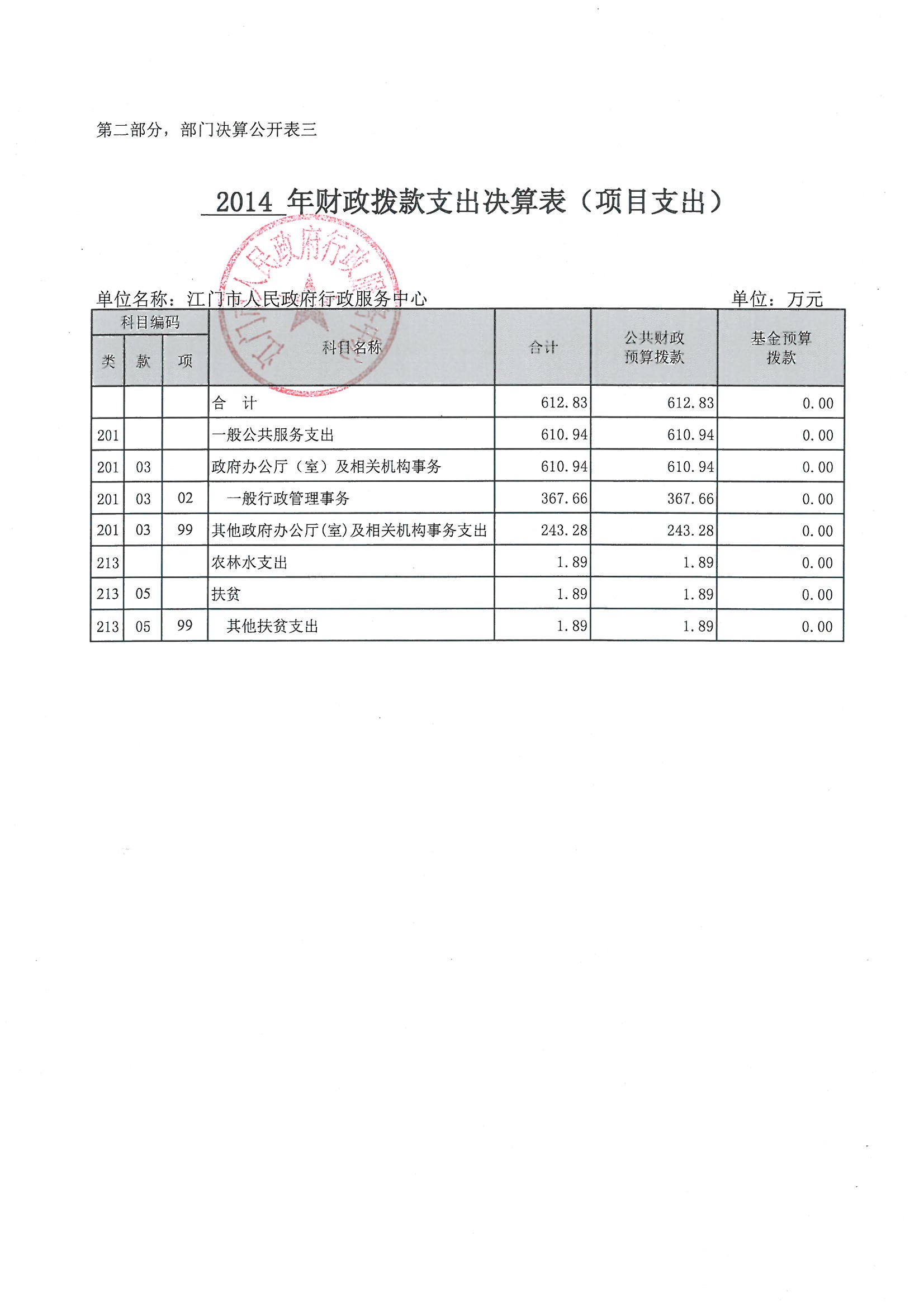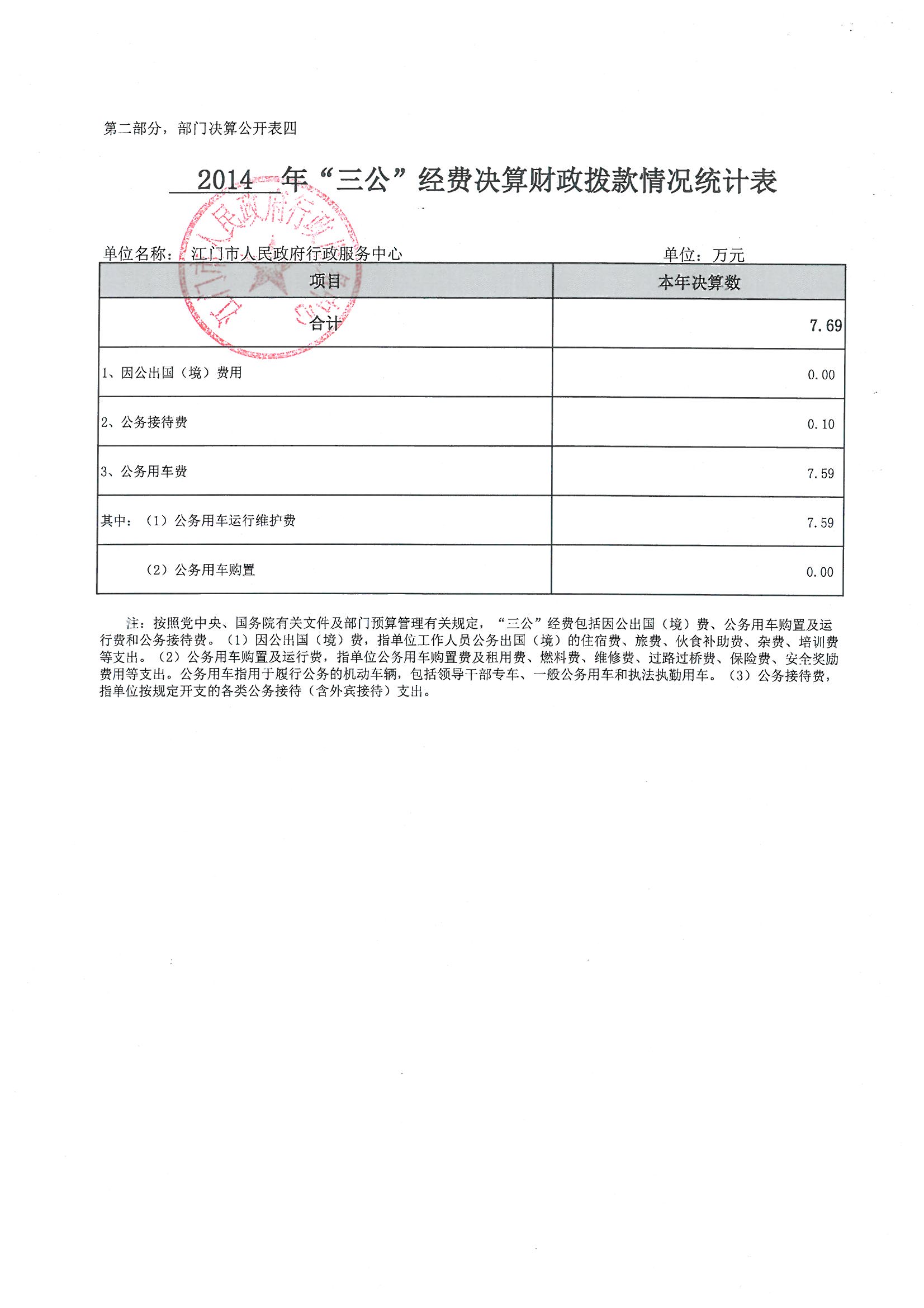 2014 年开云电竞官方网站人民政府行政服务中心(含下属单位)用财政拨款开支的出国(境)经费、车辆购置及运行费、公务接待费(简称“三公”经费)支出合计7.69万元。