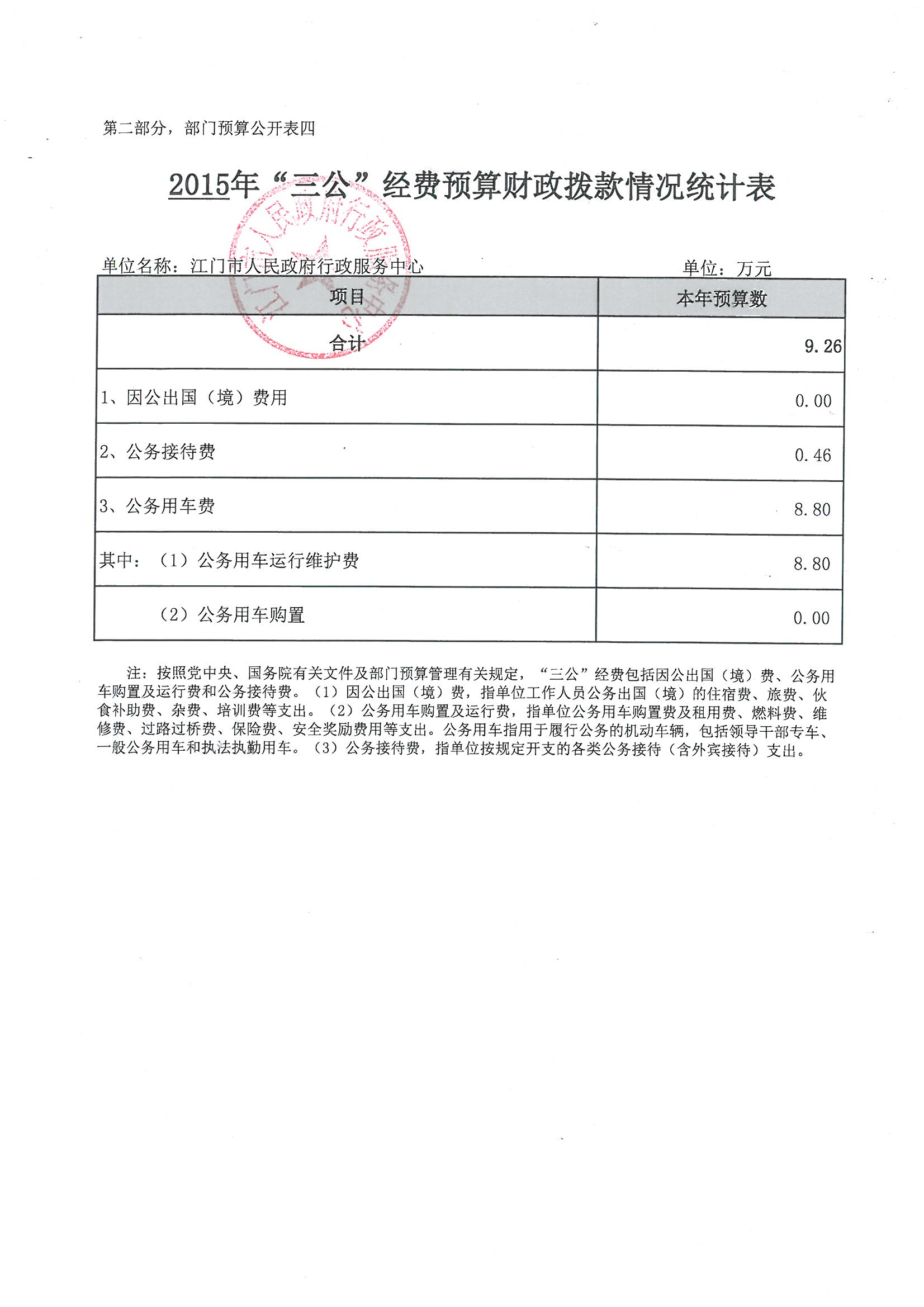 2015年开云电竞官方网站人民政府行政服务中心用财政拨款数开支的出国(境)经费、车辆购置及运行费、公务接待费(简称“三公”经费)支出合计9.26万元。