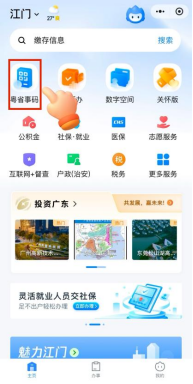 2.在手机“粤省事”中选择出示“粤省事码”。选择“港澳居民来往内地通行证”“港澳台居民居住证”登录。