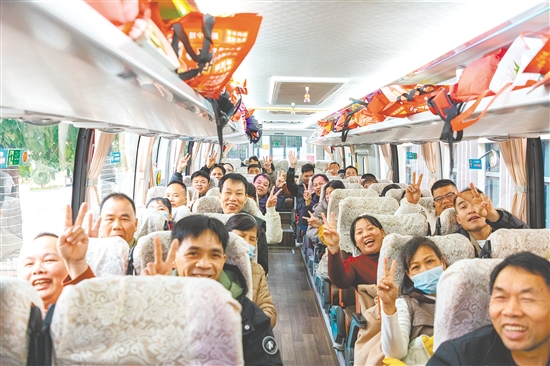 昨日(2月10日),52名在江门新会务工的广西崇左宁明县职工及家属乘坐新会“幸福大巴”开心返乡。