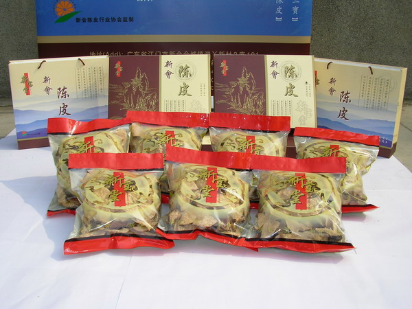 新会陈皮,特指用新会柑果皮经在新会境内晒制和贮存陈化的干品,是“广陈皮”正品。是新会传统土特名产。历史上曾经有过栽培面积近10万亩,初级产品产量超5000吨的高峰。目前,种植面积近1万亩,初级产品产量约1000吨。
