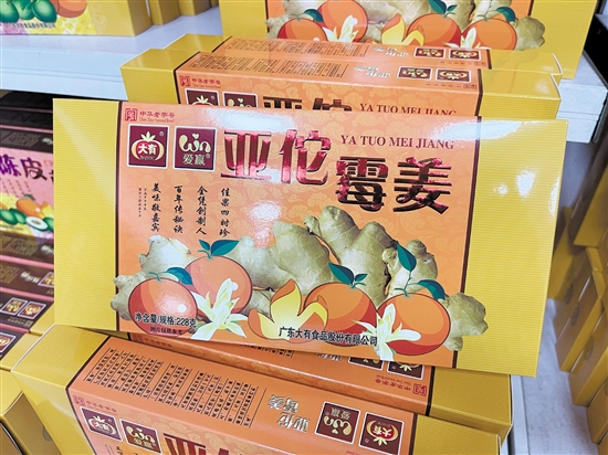 来到位于新会区三和大道北的大有食品专卖店,空气中飘着阵阵香甜。走进店内,陈皮梅、陈皮花生、亚佗霉姜、应子等“明星产品”琳琅满目,种类繁多。