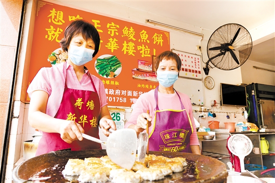 位于荷塘镇的“新华楼”,有着传承了近百年的荷塘煎鱼饼传统技艺。新华楼负责人容明光是第五代传人,正在申报蓬江区非物质文化遗产项目代表性传承人。