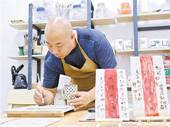 市工艺美术师郑文贺通过5年的摸索,将侨批活灵活现地“复制”到陶瓷上,创新了侨批保护、活化利用方式。经郑文贺的妙手,侨批被赋予了全新的生命,与陶瓷艺术来了一场“新式碰撞”,成为一个个或端庄或精巧的工艺品。