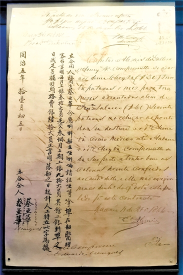 在中国侨都华人华侨博物馆(以下简称“侨博馆”),有一份既普通又特殊的藏品。说它普通,是因为它只是诸多纸质文物中不起眼的一份;说它特殊,是因为它是国内目前发现的唯一一份有关劳工出洋跟船医生合同。这就是存放在侨博馆的“蔡亚华受聘为赴哈瓦那跟船医生的合同”,它和一份鹤山籍古巴华工的“雇工合同”一起,摆放在展厅第一部分“远赴重洋”展柜中,无声地诉说着华侨辛酸血泪历史。