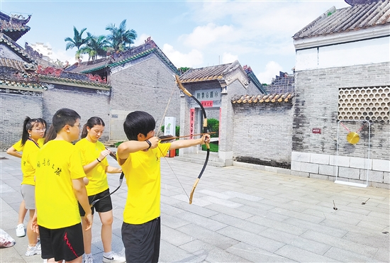 华裔青少年在陈白沙纪念馆体验中国古代六艺中的射箭。