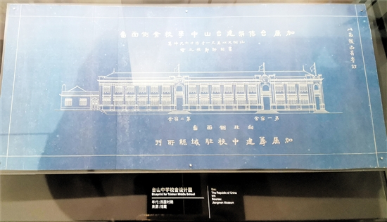 存放于侨博馆的《加属台侨捐建台山中学校舍侧面图》,蓝色为底,白色绘图,恢宏大气,落款为“加属筹建中校驻域总所刊”。不过记者采访了解到,这大概率只是当年诸多设计图中的一份,并没有依其施工建设。