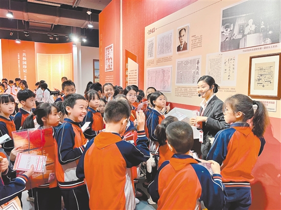 开幕当天,“共和国印记主题研学”同步进行,同学们在讲解员带领下参观展览。黎禹君 摄