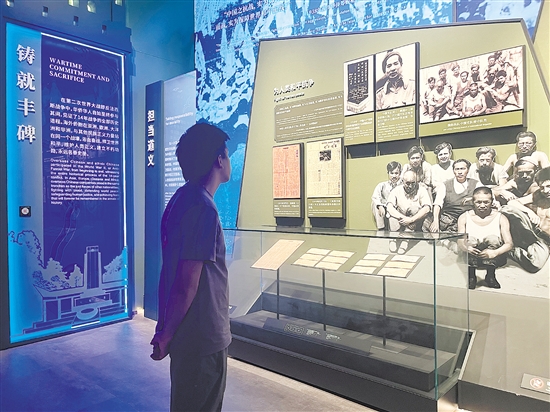 在侨博馆“铸就丰碑”展示区,参观者通过图文、实物等回顾海外侨胞的抗战故事。