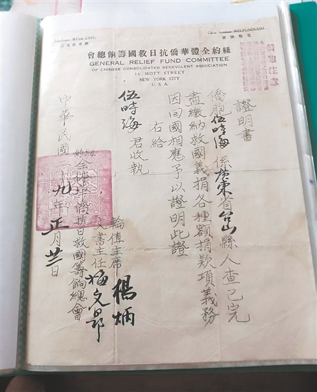 据统计,李春荣累计捐赠史料达214件(份),其中不乏极具历史价值的华侨捐款凭证,包括《纽约全体华侨抗日救国筹饷总会证明书》《华侨拒日救国后援总会捐款收条》《旅美台山宁阳总会馆、余风采总堂抗敌救乡救国捐款收条》《墨西哥尾利打抗日救国后援会捐款收条》等。