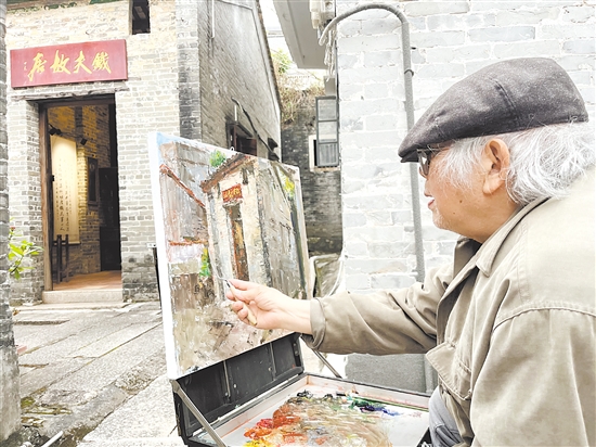 铁夫故居前画架林立,空气中弥漫着松节油与创作热情交织的气息。美国油画大师、华人美术家涂志伟在巷口架起了画板,细致地观察铁夫故居,画笔在他手上迅疾游走,勾勒出故居骨架,然后用油画刀如雕刻般在画布上再现出故居的岁月痕迹,很快便把眼前的景色转化为一幅兼具质感与情感的油画作品。