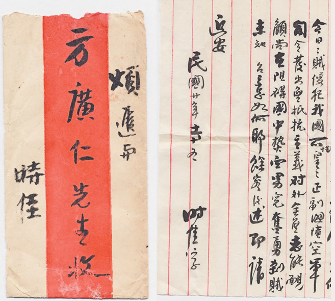 1931年11月15日,事变发生尚不足两月,美国华侨方时佳在致方广仁的信中痛切写道:“奈因国弱无能,屈屈奈何?!今日日贼侵犯我国,可惜皇皇正副海陆空军司令发出无抵抗主义……”字里行间,激荡着对时局的愤懑,更饱含对民族命运的深切忧思。