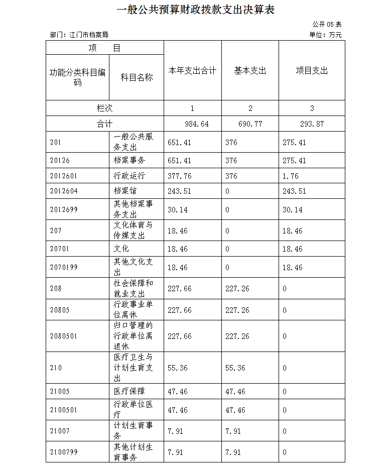 其中:一般公共服务(类)档案事务(款)377.49万元,主要用于行政运行、档案馆和其他档案事务支出;社会保障和就业支出(类)行政事业单位离退休(款)227.66万元,主要用于归口单位的行政单位离退休;医疗卫生与计划生育支出(类)医疗保障(款)47.46万元、计划生育事务(款)7.91万元;住房保障支出(类)住房改革支出(款)31.75万元。