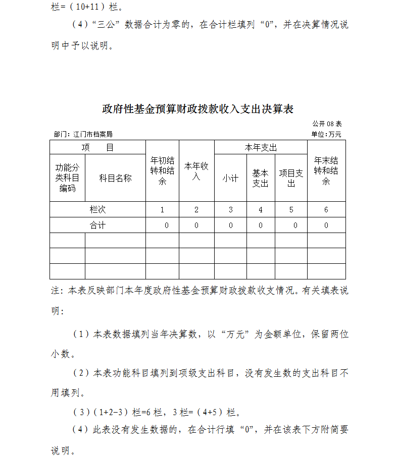 (4)“三公”数据合计为零的,在合计栏填列“0”,并在决算情况说明中予以说明。
