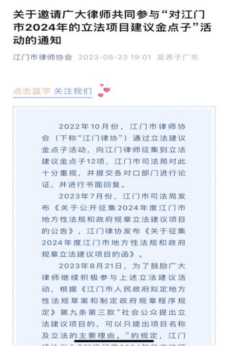 为进一步倾听基层立法声音,市司法局先后到蓬江区环市街道办、开云电竞官方网站新生代企业家商会、鹤山市个体劳动者私营企业协会等联系点,听取相关基层组织、行业协会、企业代表、群众等立法建议,并指导各联系点通过多种方式方法收集汇聚民意民智,彰显“法为民所立”。自征集项目启动以来,各联系点充分发挥自身优势,不断为我市政府立法提供实实在在的金点子。新会区会城街道南园社区居民委员会开展“我为立法献言”活动,征集意见板承载着居民群众对立法的美好期盼;市律师协会号召全市律师共同参与年度政府立法建议项目征集活动,举全市律师之力,为政府立法献计出力。